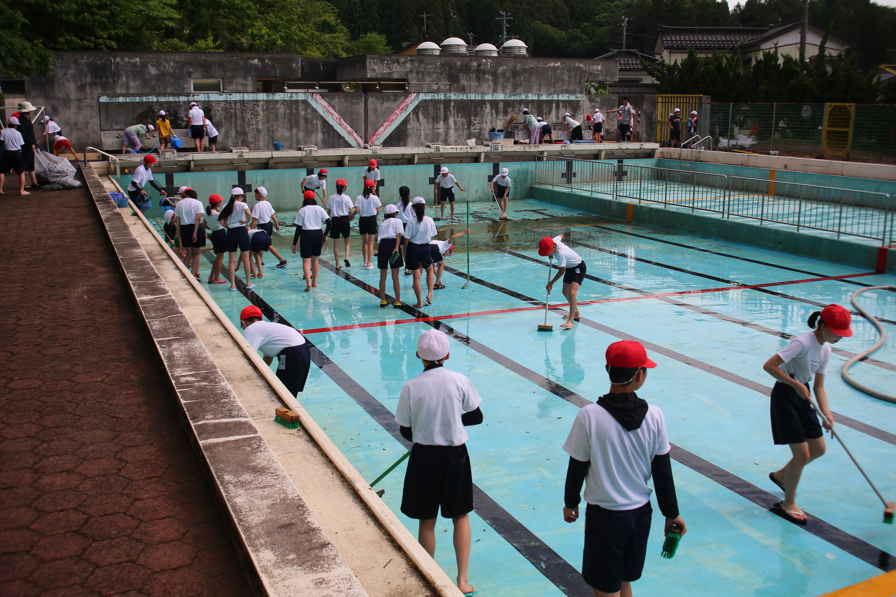 | 令和6年5月30日「プール清掃」 午前中には5年生の田植えがありましたが、この日の午後は4~6年生によるプール清掃が行われました。 4年生は、プール周辺の草取りをしました。いろいろな所から雑草が生えていて、採るのが大変でした。5年生は、シャワーや足洗い場、更衣室やトイレの清掃をしました。コケや汚れが落ちにくくて、きれいにするのが大変でした。6年生は、プールの壁面と床を磨きました。こびり付いた汚れは、ブラシで何度もこすってもなかなか落ちませんでした。落ち葉や木の枝もたくさんあり、全部を取り除くのが大変でした。しかし、作業中の子どもたちからは、「きれいになっていくと、やりがいがあるなあ」という声がたくさん聞こえてきました。沼のようになっていたプールがきれいになり、とても清々しい気持ちになりました。水泳の授業がとても楽しみです。 |