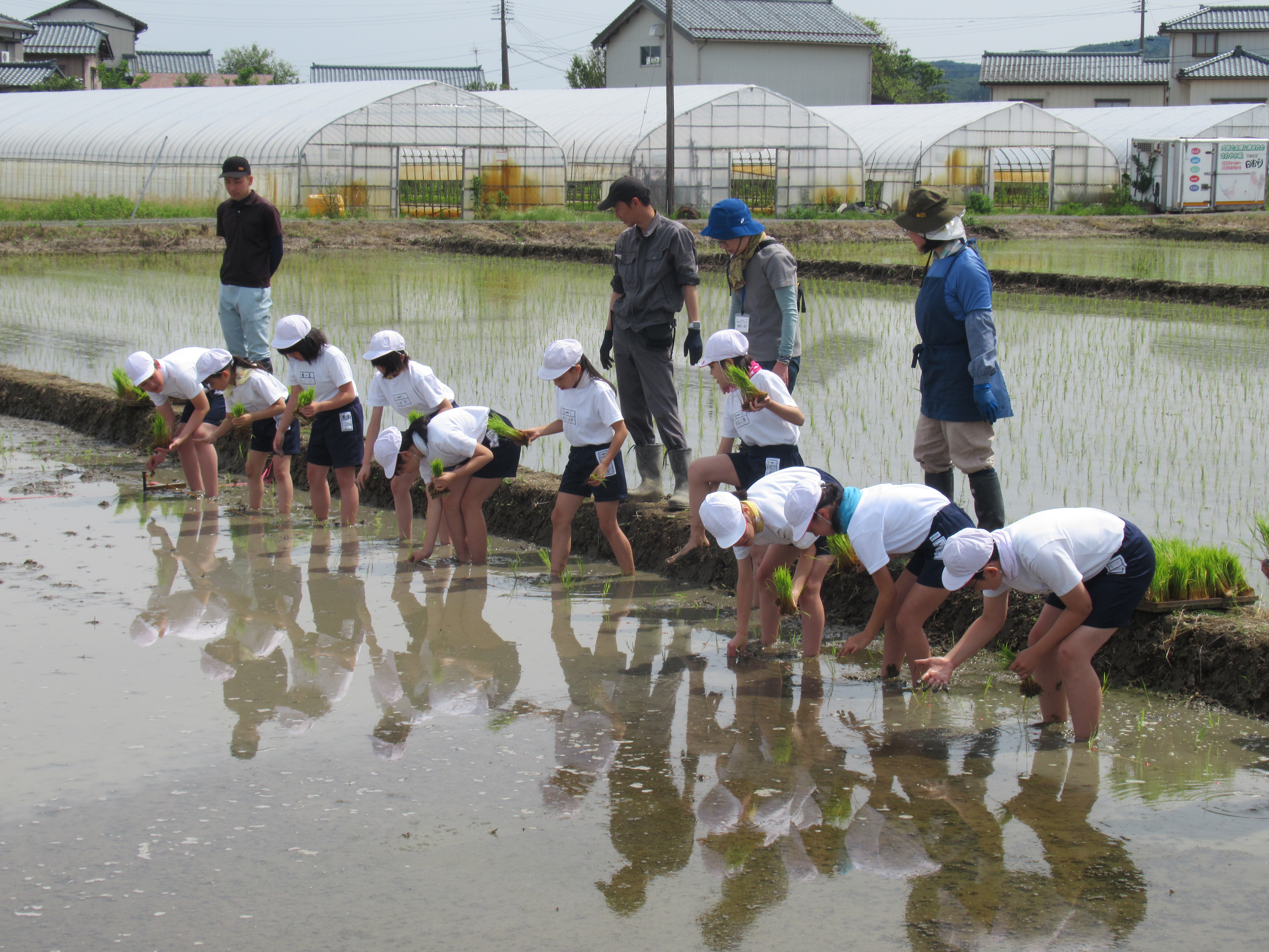 | 令和6年5月30日「田植え体験(5年生)」 午前中、5年生の子どもたちは、「ライス・イア・コープ」の田んぼを借りて田植え体験をしました。田んぼに足を入れたときは、「わっ、ぬるぬるする!」と眉間にしわを寄せる子どもがいましたが、慣れてくると互いに声を掛け合いながら、笑顔で作業をしていました。植え終わった後は「協力できてよかった」「またやってみたい!」と感想を述べる子どもがいました。 苗を植えることの大変さや楽しさを実際に経験できたことは、子どもたちにとっては大変貴重な経験になったようです。 |